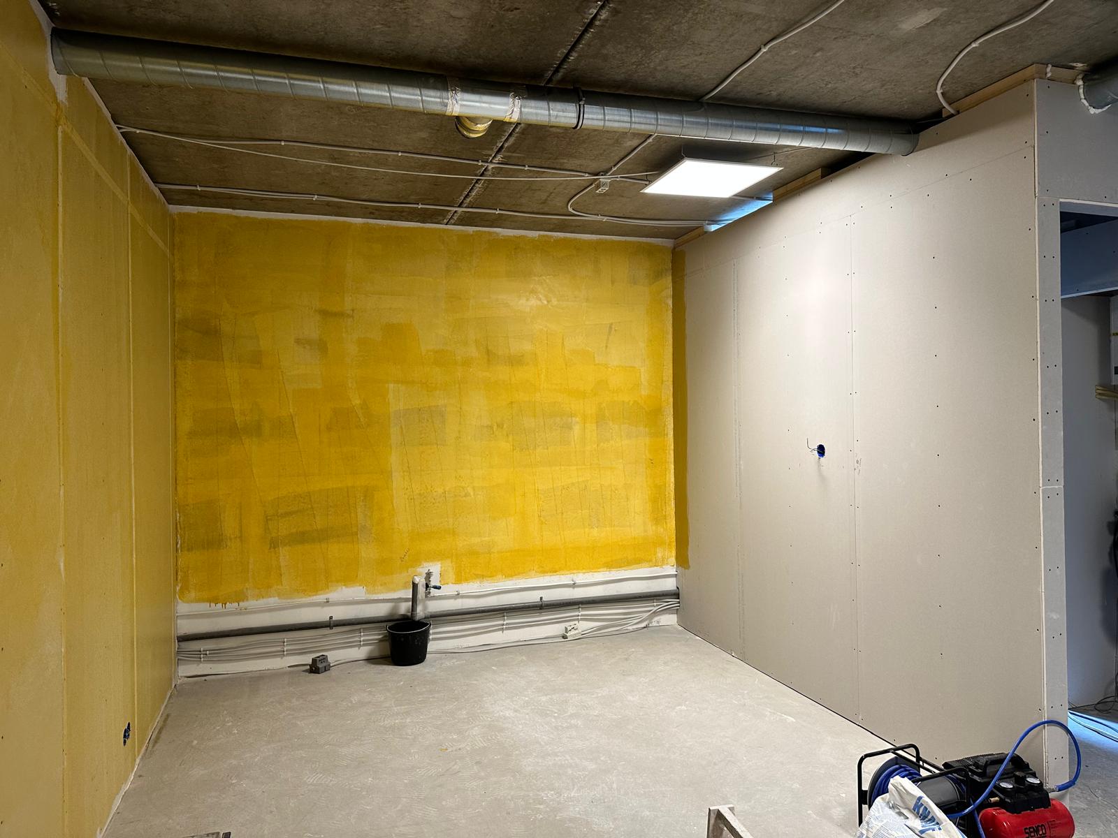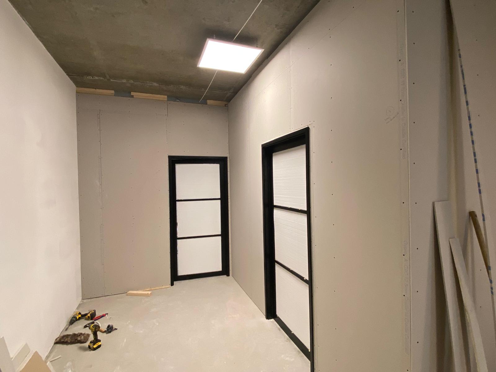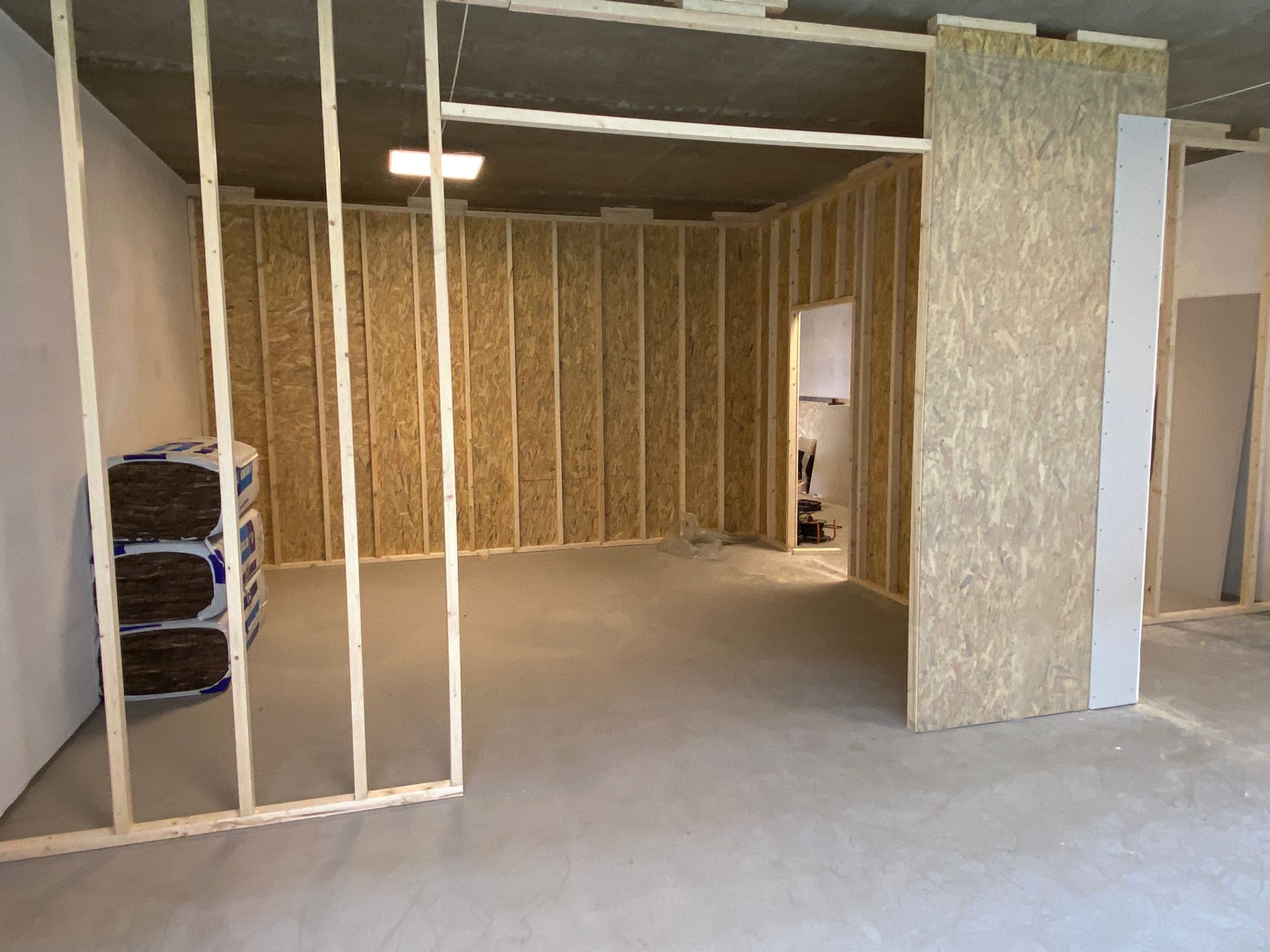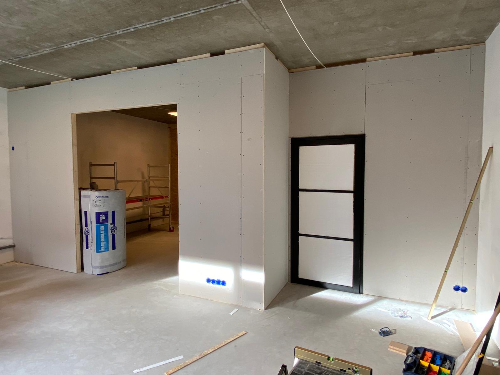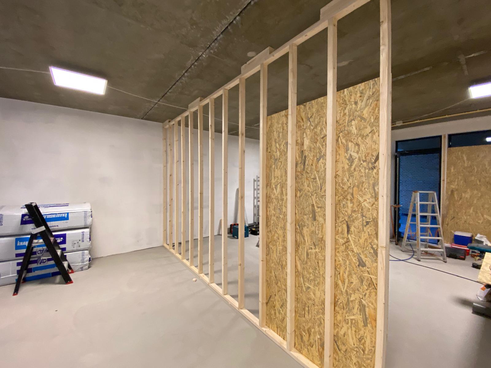 Na het beoordelen van de tekeningen van de architect zijn wij begonnen met plaatsen van de wanden (voor behandelruimtes en wachtruimte), deuren- en kozijnen