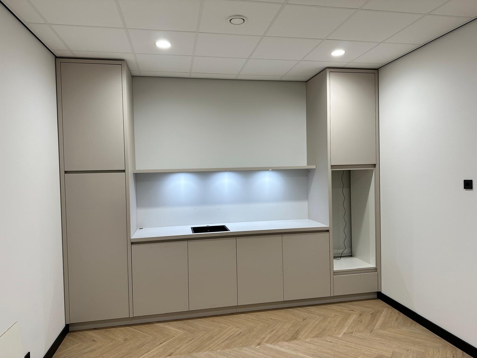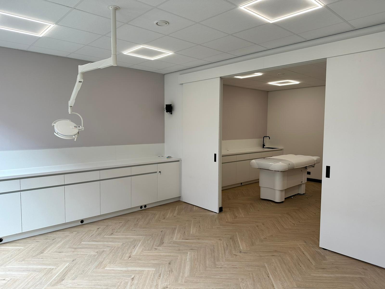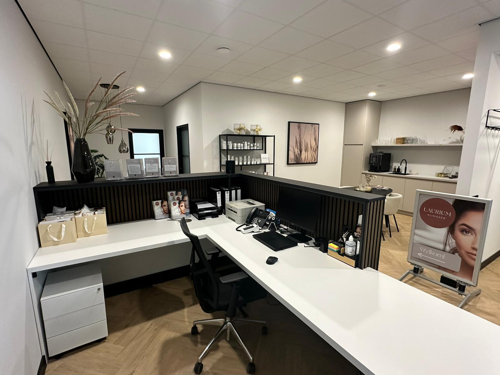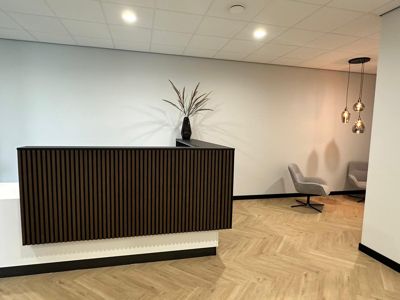 Na het leggen van de vloer zijn door onze interieurbouwer de 3 op maat gemaakte keukens in de behandelruimtes, en een balie in de ontvangstruimte.