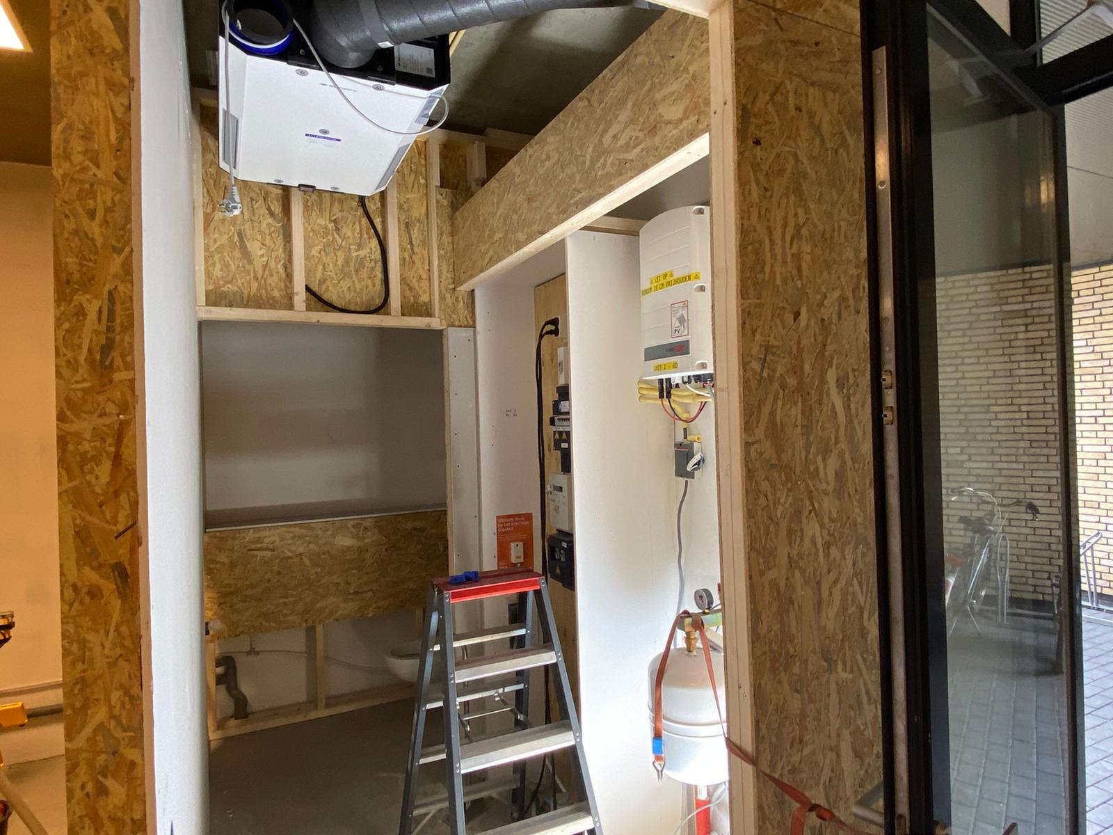 Wat volgt is het aanleggen van de elektra. Water,- en afvoer voor iedere behandelkamer, keuken, toilet.